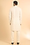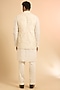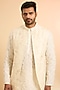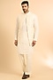 Featuring an ivory bundi jacket in pure raw silk base. It is paired with an organza kurta and pants. Style it with mojaris for a festive occasion, wedding, engagement or sangeet ceremony.
