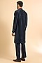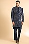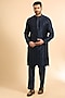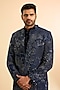Featuring a navy blue indowestern jacket in chanderi base with tonal embroidery. It is paired with a velvet kurta and pants. Style it with mojaris for a wedding, engagement or sangeet ceremony.