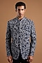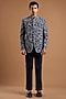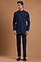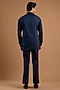 Featuring a navy blue bandhgala jacket in silk base. It is paired with a shirt and pants. Accentuate it with classic black or polished leather mojaris and a sleek wrist watch for a refined finish, making it ideal for wedding receptions, cocktail evenings or formal social gatherings.