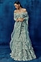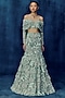 Featuring a mint layered top in tulle base with embroidery. It is paired with an embroidered fish-cut layered skirt and a dupatta. Accentuate it with zircon or pearl jewellery, soft curls and embellished heels for a sangeet or cocktail ceremony.