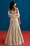 Featuring a muted pink skirt in tulle base with embroidery. It is paired with an embroidered corset and a tulle drape. Accentuate it with statement earrings and heels for an evening wear.