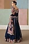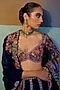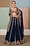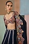 Featuring a navy blue lehenga in organza base with embroidery. It is paired with a tulle blouse and a silk dupatta. Accentuate it with dangler earrings and heels for a wedding or engagement ceremony.