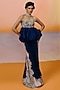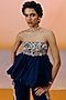 Featuring a navy blue top in organza base with floral embroidery and bubble hem. It is paired with kalidar pants. Accentuate it with statement jewellery and embellished heels for a sangeet or cocktail ceremony.