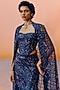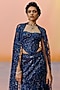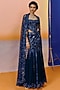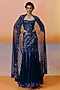 Featuring a navy blue corset in organza and tulle base with floral embroidery. It is paired with an embroidered flared skirt and an embroidered cape. Accentuate it with swarovski or pearl jewellery, embellished heels and a clutch for evening celebrations, sangeet or cocktail ceremony.