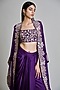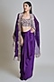 Featuring a purple triangle cape in organza base with assorted leaves detailing. It is paired with a tulle floral bustier and a satin draped skirt. Accentuate the set with statement jewellery, embellished heels and a clutch for an elegant look, Perfect for your cocktail, sangeet or engagement ceremony.