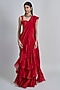 Featuring a red pre-draped saree in organza and crepe base. It is paired with a tulle corset having wildflower detailing. Accentuate the designer saree with swarovski or silver jewellery, embellished heels and a potli bag for a bridal look, Perfect for your wedding, sangeet or cocktail ceremony.