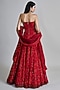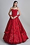 Featuring a red lehenga in organza base with floral and mirror embroidery. It is paired with a tulle corset and a dupatta. Accentuate the designer lehenga with swarovski or silver jewellery, embellished heels and a potli bag for an elegant look, Perfect for your wedding, sangeet or engagement ceremony.