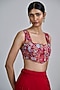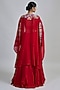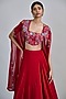 Featuring a red pleated cape in organza base with floral detailing. It is paired with a tulle bustier and a skirt. Accentuate the set with silver jewellery, embellished heels and a clutch for an elegant look, Perfect for your cocktail, sangeet or engagement ceremony.