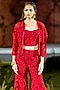 Mishru presents a red cape in organza base. It is paired with a corset and layered sharara pants having floral detail. Accentuate the look with block heels and ear cuffs to strike the perfect balance between elegance and edge at cocktail soirees.