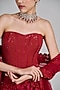 Featuring a red fish-cut layered lehenga in tulle base with assorted leaves detailing. It is paired with a tulle bustier and a dupatta. Accentuate the set with statement jewellery, embellished heels and a clutch for an elegant look, Perfect for your cocktail, sangeet or engagement ceremony.