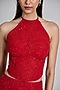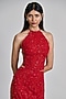 Featuring a red halter corset in tulle base with floral detailing. It is paired with a slim skirt. Style it with zircon earrings, a clutch bag and block heels for an elegant look. Perfect for evening soiree, cocktail or sangeet ceremonies.