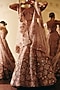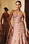 Mishru features an exquisite rose gold ombre lehenga in tulle base with floral embroidery. It is paired with a sculpted corset and a dupatta. Style this designer set with zircon jewellery, soft floral hair, and a sleek clutch for a sophisticated bridal ensemble, perfect for your big day or engagement.