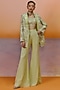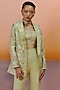 Featuring a sea green blazer in organza base with floral embroidery. It is paired with an embroidered bustier and pants. Accentuate it with statement jewellery and block heels for festive celebrations or mehendi ceremony.
