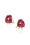 Gold Finish Cubic Zirconia & Red Stone Enameled Floral Stud Earrings In Sterling Silver
