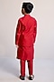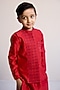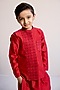 Featuring a red nehru jacket for boys in cotton base with embroidery. It is paired with a silk chanderi kurta and pyjama. Style it with juttis and a watch for a festive occasion or wedding ceremony.