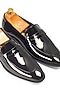 Featuring a pair of patent black penny slip-ons in synthetic leather base with spanish cut detail. It is paired with a synthetic leather lining and a rubber sole. Elevate your stride with timeless elegance and exceptional craftsmanship, perfect for formal events.