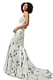 Featuring a powder blue off-shoulder mermaid gown in satin base with stone embellishment and applique leaves detail. Accentuate it with delicate earrings, strappy heels, and a sleek clutch for an elegant look, perfect for dinner dates or evening parties.