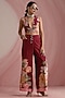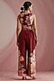 Featuring a maroon overlay in pure organza base with print and machine embroidery. Style it over a co-ord set with geometric earrings and strappy sandals for a modern cocktail or art showcase.