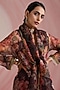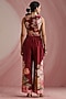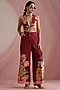 Featuring a maroon overlay in pure organza base with print and machine embroidery. It is paired with a pure chanderi silk blouse and trousers. Pair with geometric earrings and ankle-strap sandals for a modern cocktail or art showcase.