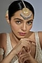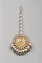 Featuring a gold finish maangtikka studded with kundan polki, pearls and light blue beads, set in mixed metal. Perfect wear for a pooja ceremony or a festive occasion.