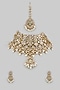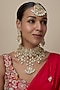 Featuring a gold finish choker necklace studded with moissanite, mint green stones and pearl beads, set in mixed metal. It is paired with a matching pair of earrings and a maangtikka. Perfect choice for weddings and other Indian festivities.