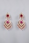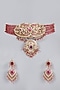 Featuring a gold finish choker necklace studded with pink jadau and pearls, set in mixed metal. It is paired with a matching pair of earrings.