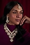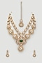 Featuring a gold finish long layered necklace studded with emerald stone, kundan polki and zircons, set in mixed metal. It is paired with a matching pair of earrings and a maangtikka. This necklace set is ideal to wear for a special event or a wedding ceremony.