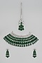 Featuring a white finish choker necklace studded with emerald stones and zircons, set in mixed metal. It is paired with a matching pair of earrings and a maangtikka. Perfect choice for weddings, parties, and other Indian festivities.