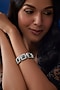 Featuring a white finish bracelet studded with zircons and emerald stone, set in mixed metal. This bracelet is ideal to wear for a special event or a cocktail party.
