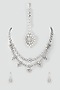Featuring a white finish layered necklace studded with zircons, set in mixed metal. It is paired with a matching pair of earrings and a maangtikka.