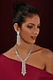 Featuring a white finish long necklace studded with zircons, set in brass. It is paired with a matching pair of earrings. Perfect wear for a wedding or celebration.