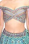 Featuring an aqua lehenga in modal satin base with highlighted print and mirror hand embroidery. It is paired with a matching opada silk off-shoulder blouse having an attached butterfly net cape.