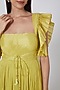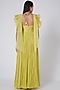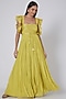 Featuring a lime green gown in silk chanderi, chinon, and lurex base with gold foil work. It is paired with a matching sequins embellished jacket having kimono sleeves and tassels.