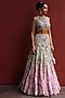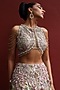 Featuring a pastel green and peppermint pink lehenga in chiffon base with side zip closure. It is paired with a shimmer organza having floral, bud lace, crystals, swarovski, pearl and crystal tassel 3D embroidery. Accentuate it with statement polki jewellery and embellished heels for a stylish ensemble, ideal for weddings, engagement ceremonies or sangeet nights.