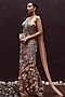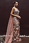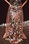 Featuring a soft mousse and peach dress in shimmer net, organza and butterfly net base with a front-slit, 3D floral applique work, swarovski lace, mirror, pearl and crochet texture detailing, including an attached drape. Accentuate it with statement diamond earrings and embellished heels for a glamorous ensemble, ideal for cocktail nights, receptions or red-carpet celebrations.