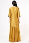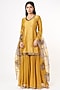 Featuring a gold kurta in dupion silk base. It is paired with matching georgette sharara pants and an organza dupatta having patchwork hand embroidery.