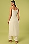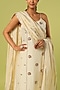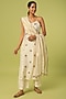 Featuring an ivory kurta in dupion silk base with hand embroidered cutdana motifs. It is paired with matching modal satin palazzo pants and a striped mul mul dupatta.