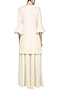 This set features an ivory short kurta in georgette base appliqued with gold thread and sequins embroidered motifs on the front. It has ivory ball hangings on the sleeves. It is paired with an ivory flared georgette pants and organza dupatta with gold embroidered motifs and red tassel hangings at the corners.