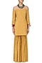 Featuring a mustard off shoulder short kurta in crepe with sequins embroidery. It is paired with mustard sharara pants in crepe with sequins embroidery.