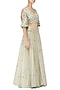 Featuring a sage green blouse in tulle with sequins embroidery and bell sleeves. It is paired sage green lehenga skirt in chantilly net with floral embroidery and dupatta in net with embellished sequins.