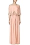 Featuring a salmon pink off shoulder cape in crepe with gold embroidery and tassel hanging. It is paired with salmon pink wide legged pants in crepe.