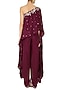 Featuring a wine one shoulder cape in crepe with multicolor floral embroidery. It is paired with wine dhoti pants in crepe with floral thread embroidery.