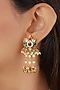 Featuring a 18kt gold plated jadau choker necklace studded with faux uncut polki stones, semi-precious beads and hangings, set in mixed metal. It is paired with a matching pair of earrings. Perfect for grand occasions like weddings and traditional festivities.