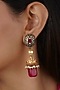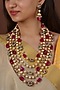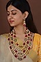 Featuring a 18kt gold plated jadau layered necklace studded with faux uncut polki stones, semi-precious beads and hangings, set in mixed metal. It is paired with a matching pair of earrings. Perfect for grand occasions like weddings and traditional festivities.