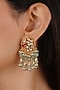 Featuring a 18kt gold plated jadau choker necklace studded with faux uncut polki stones, semi-precious beads and hangings, set in mixed metal. It is paired with a matching pair of earrings. Perfect for grand occasions like weddings and traditional festivities.