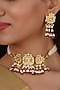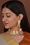 Featuring a 18kt gold plated jadau choker necklace studded with faux uncut polki stones, semi-precious beads and hangings, set in mixed metal. It is paired with a matching pair of earrings. Perfect for grand occasions like weddings and traditional festivities.
