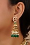Featuring a 18kt gold plated jadau choker necklace studded with faux uncut polki stones, semi-precious beads and hangings, set in mixed metal. It is paired with a matching pair of earrings. Perfect for grand occasions like weddings and traditional festivities.