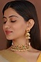 Featuring a 18kt gold plated jadau choker necklace studded with faux uncut polki stones, semi-precious beads and hangings, set in mixed metal. It is paired with a matching pair of earrings. Perfect for grand occasions like weddings and traditional festivities.