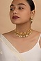 Featuring a 18kt gold plated jadau choker necklace studded with faux uncut polki stones, semi-precious beads and hangings, set in mixed metal. It is paired with a matching pair of earrings. Perfect for grand occasions like weddings and traditional festivities.