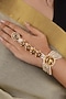 Featuring a 18kt gold plated jadau haathphool studded with faux uncut polki stones, semi-precious beads and hangings, set in mixed metal. It is paired with a matching pair of earrings. Perfect for grand occasions like weddings and traditional festivities.